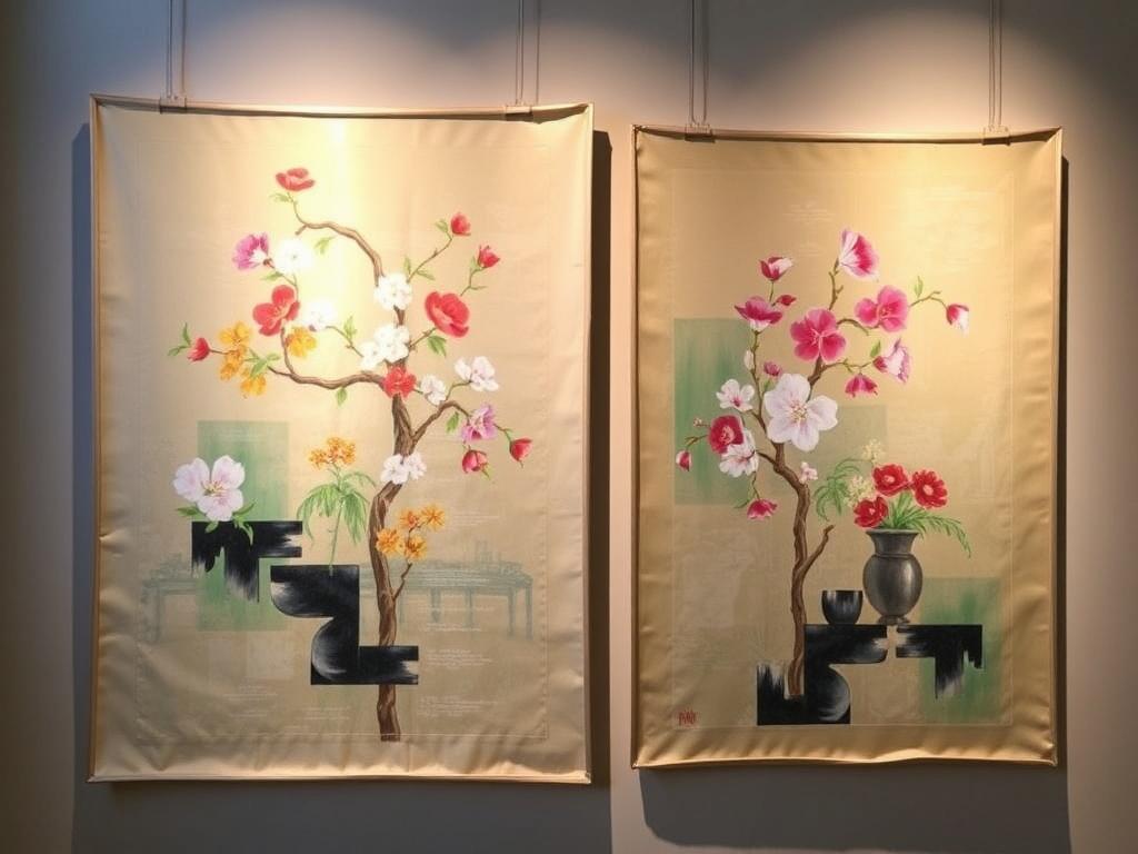 Если речь идёт о выставке, где присутствуют работы разных авторов и техник, можно сгруппировать шелковые картины по пластическим элементам: например, светлые и прозрачные слои — в одну зону, более насыщенные — в другую. Это создаёт визуальную дорожку, по которой зритель перемещается. Но главное — позволить шелку дышать. Не перегружайте стену лишними деталями, дайте глазу возможность отдыхать между двумя полотнами.