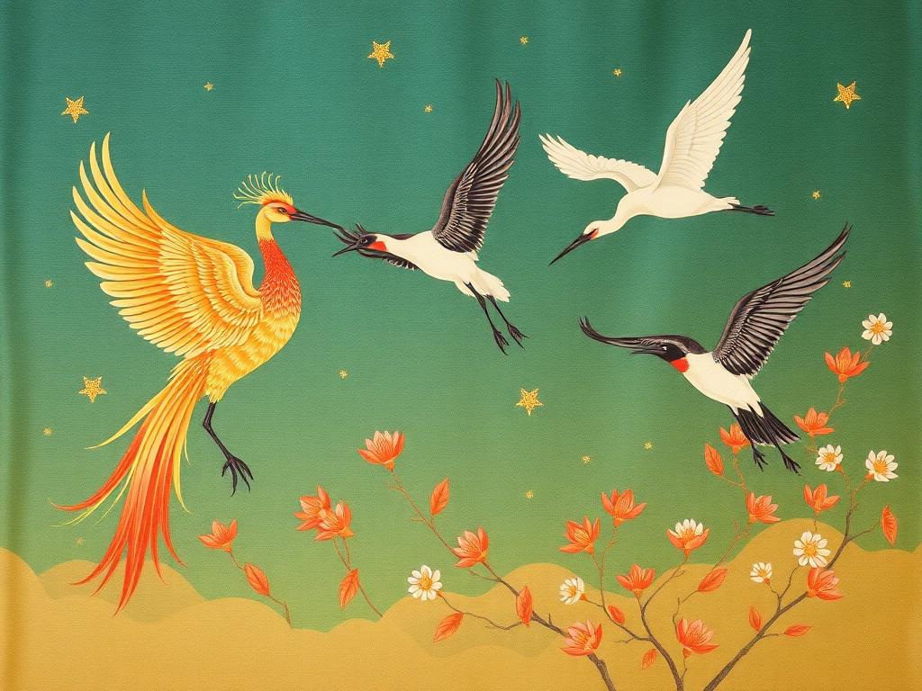 Синергия образов: как феникс, журавль и соловей соединяются на шелке