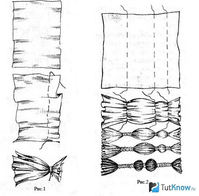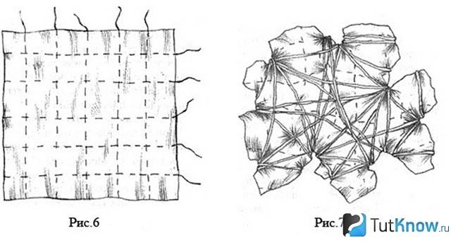 На первом рисунке показано, что нужно сперва прошить наметкой, затем затянуть эту нить и накрутить ее на данное место. На втором рисунке уже 3 наметочных шва — два из них делают справа, а третий — слева. Останется затянуть нить, намотать ее, и можно красить ткань, чтобы получился батик.