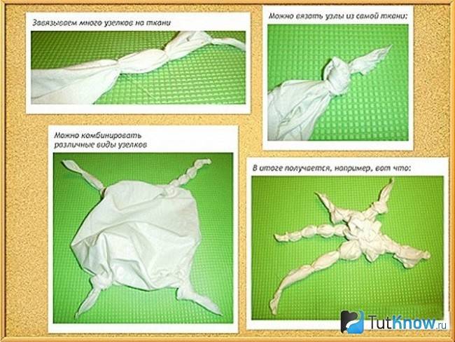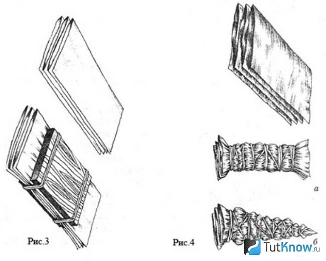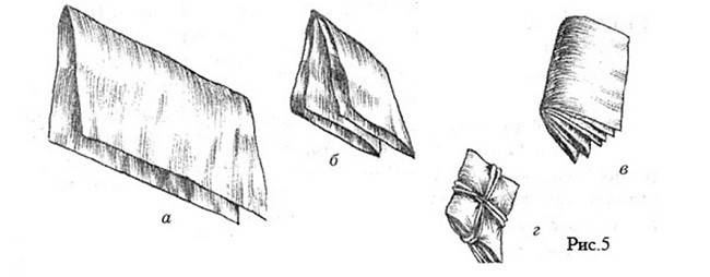 Сначала ткань сворачивается «гармошкой». Теперь к лицевой стороне нужно приложить дощечку, перевязать ее в двух местах нитями. Ткань на рис. 4 также сначала складывают «гармошкой». Затем ее нужно перемотать нитью и придать заготовке форму елочки, также при помощи нитей. Таким образом можно изготовить детский батик, декорируя футболку для ребенка.