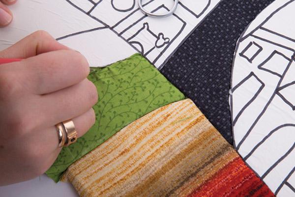 Дальше наступает самое интересное! Выполнение работы начинается с самой маленькой детали. Для неё вырезается лоскуток ткани, который приклеивается на основу. Чтобы лоскутки соответствовали частям рисунка можно их выкроить, воспользовавшись ранее нарисованным эскизом и не забывая делать припуски по 0,5 см с каждой стороны детали. Вырезанный кусочек материала прикладывается к пенопласту и с помощью острого предмета заправляется в прорези.