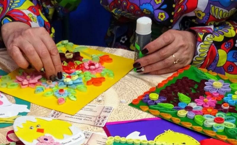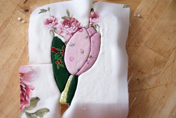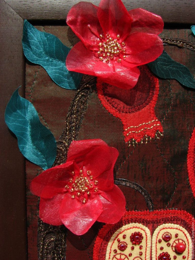 - Далее следует сам процесс создания аппликации: краешки всех сделанных подготовленных из ткани частей необходимо протолкнуть в канавки, чтобы они края погрузились в канавки и там плотно зафиксировались.