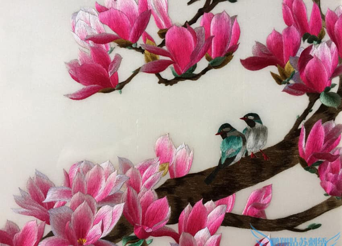 - Самой утонченной и элегантной считается вышивка под названием «Су». Ее характерной особенностью является то, что нить, используемая для вышивки, делится на несколько очень тонких частей. Кроме того подобного рода вышивка выполняется исключительно плотными, гладкими и аккуратными стежками. Для создания картины при помощи такой техники вам нужно будет использовать лаконичную и довольно плавную цветовую палитру;