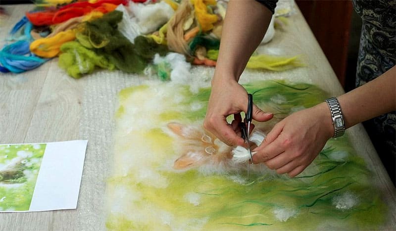 Поначалу на работу нужно отводить по паре часов в день, чтобы не замылился глаз и были соблюдены все пропорции рисунка – это основное правило шерстяной живописи. Можно выбрать эскиз в интернете, распечатать на цветном принтере и положить его под тонкий флизелин, но лучше, чтобы рисунок был перед глазами – так намного проще будет подбирать оттенки и создавать предметы.