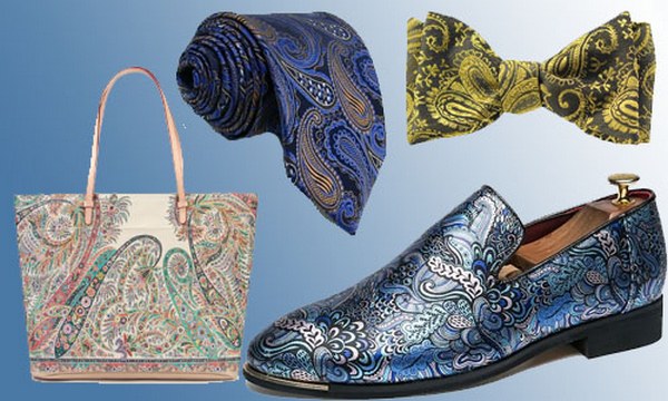 Мужчины также приветствуют аксессуары с модным узором. Сильный пол выбирает галстуки с подобным рисунком. Такой аксессуар будет органичен в праздничных и деловых образах. Те из них, которые предпочитают шейные платки и увидели их с пейсли на фото в каталогах модных домов, с удовольствием дополняют ими свои повседневные и торжественные аутфиты.