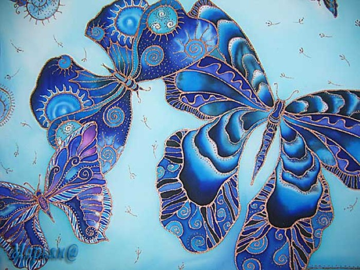 Начиная заниматься новым для себя видом деятельности, каждый человек вначале изучает эту деятельность теоретически. Узнав, что она из себя представляет, стремится попробовать. Здесь начинаются первые проблемы и вопросы. С чего начать? Основной вопрос, мучающий новичка.Батик в этом плане ничуть не отличается от иных видов деятельности. Узнав механику нанесения рисунка и требуемые материалы, новичок испытывает потребность нарисовать свою первую картину на ткани. Как известно, для того, чтобы наносить правильный рисунок, необходимо представлять себе, что должно выйти в конце. Сомнительно, что начинающий художник сможет удержать в голове и способ рисования и механику и конечный рисунок. Для облегчения этой задачи, мы подготовили подборку батик рисунков для начинающих заниматься этим, несомненно достойным, искусством.Конечно, лучше всего по первой использовать простые графические рисунки. Состоящие из 1-3 цветов. Их нетрудно будет нанести даже не очень хорошо рисующему человеку. К примеру, такую бабочку можно распечатать на самоклеющейся бумаге для принтера, вырезать трафарет и, приклеив его к ткани, наносить резерв или краску.
