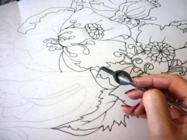 Обведите карандашный набросок специальным контуром. Контур не позволит краске вытечь за пределы линии при дальнейшей росписи ткани.