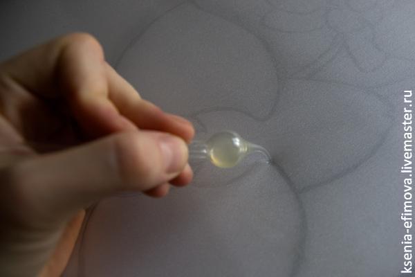 3)Теперь необходимо обвести рисунок по контуру резервирующим составом. Набираем резерв в трубочку. Это делается спринцовкой. Спринцовка сжимается, приставляется к широкому концу трубочки и резерв засасывается внутрь. Достаточно будет наполнить трубочку до половины резервуара.