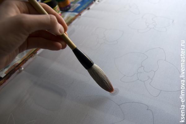 При росписи кистью сначала на ткань наносится рисунок, а затем окрашивать соответствующими красителями. При этом очень удобно иметь под рукой кусочек похожей ткани, чтобы делать предварительные цветовые пробы.