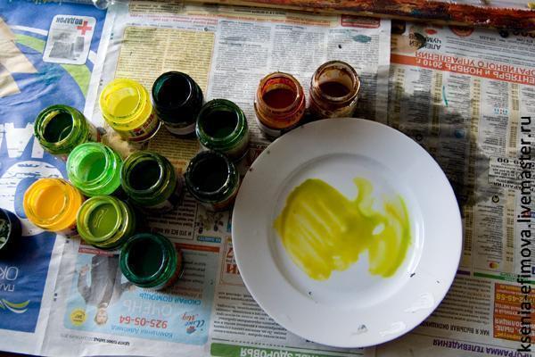 9)На палитре готовим цвета для росписи фона. Помните, что это будет только первый слой краски, которую мы наносим на фоновую часть, поэтому лучше, чтобы она была не очень яркой.