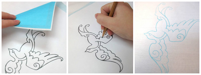 Оригинальный рисунок должен быть на кальке. Обведите его с обратной стороны карандашом или влажным мелом, затем аккуратно положите на ткань и несколько раз прогладьте рукой.