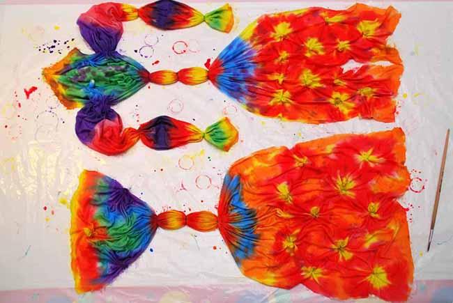 На ткани мастер завязывает узлы, перекручивает материл, что создает впоследствии интересные узоры и разводы. Именно узлы помогают резервировать определенные фрагменты ткани. Сначала новичок скручивает их по шаблону, затем экспериментирует.
