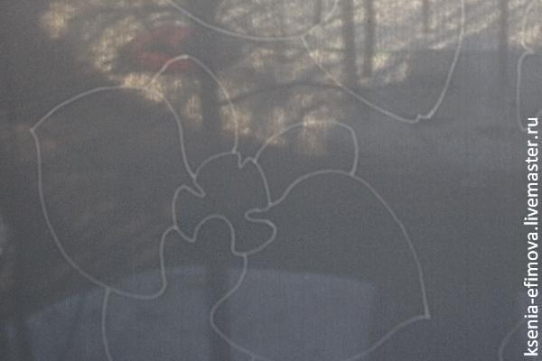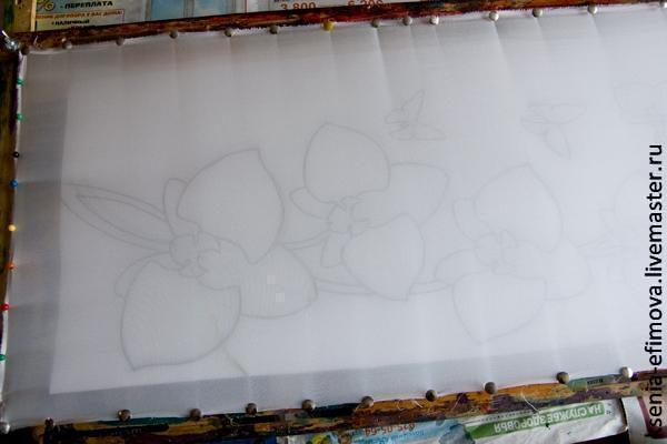 2)Под ткань подкладываем и закрепляем эскиз рисунка. Натуральный шелк – это достаточно тонкая ткань, поэтому рисунок виден хорошо.