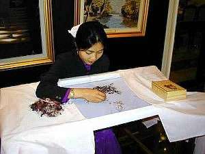 Обратите внимание на то, что мастера вышивает на специальном подрамнике, который установлен на удобной для них высоте. Кроме того вышивальщица периодически поворачивает этот подрамник. Стежки делаются молниеносно, но перед тем как проткнуть ткань женщина ненадолго замирает, выбирая подходящую точку будущего прокола
