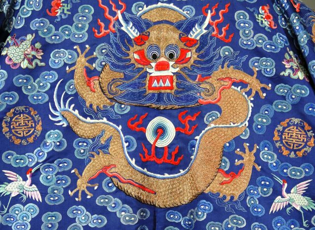 Также у каждой императорской династии существовало определенное символическое животное, которое изображалось на царской одежде, например, лев, журавль, цилинь. Однако универсальным для одежды правителя являлось изображение драконов. Дракон — одно из самых почитаемых животных в китайской мифологии, он олицетворяет силу, мощь, великодушие. На одежде императора было принято размещать сразу пять драконов, этот рисунок был доступен только высшему лицу в государстве.