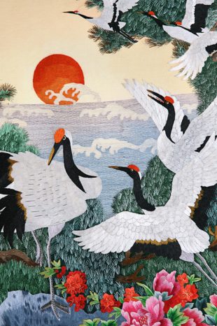 «Yue». На таких полотнах чаще всего передают всю мощь и волшебство, изображая птицу «Феникс», либо драконов. При вышивании используются яркие, насыщенные цветовые палитры, а стежки поражают ровностью и гладкостью.