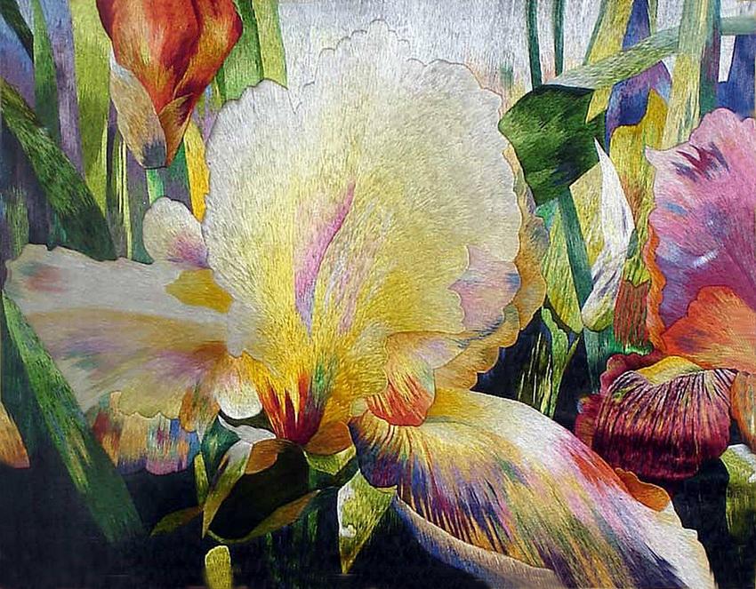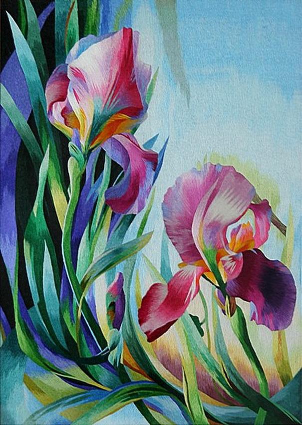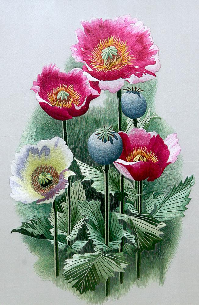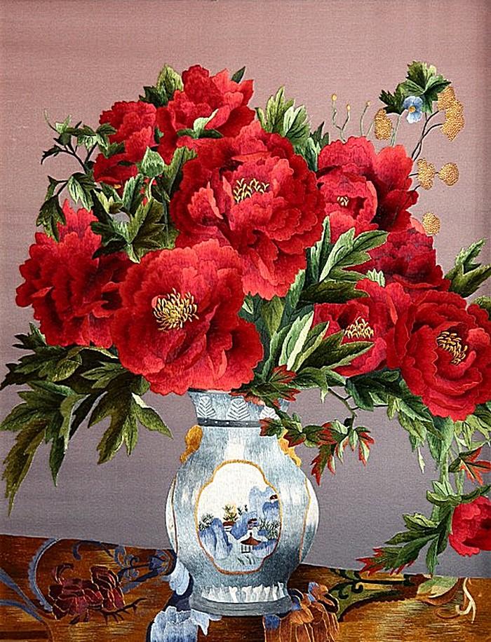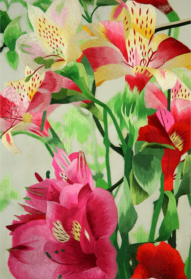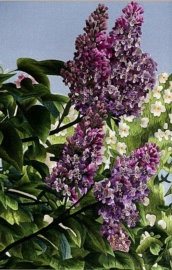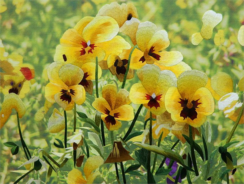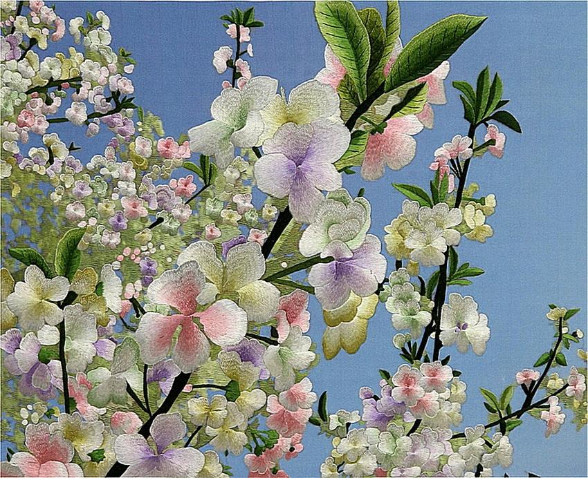 В 30-е годы появился стиль “Произвольный стежок”: эта техника вышивки предполагает использование стежков различной длины и направлений, а также наложение многочисленных слоев шелковых нитей различных цветовых оттенков, что позволяет добиться поразительного эффекта игры света, “трехмерности” и реалистичности вышитых картин.