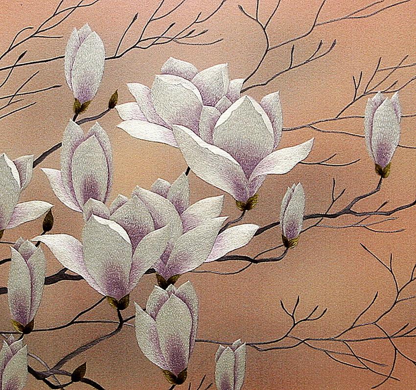 Вышивка шелком по шелку – жемчужина восточных искусств. Согласно письменным источникам, данный вид прикладного искусства зародился в эпоху Троецарствия (Древний Китай, более 2 тысяч лет назад): император Сунь Цюань приказал сестре своего главного министра вышить “Карту Царств”. Горы, реки, города и строения были изображены в мельчайщих деталях на одном квадратном полотне шелковой ткани.