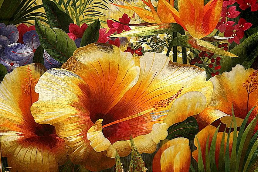 Для произведения большой картины у вышивальщицы может уйти вся жизнь…Как, например, на этих больших картинах размером примерно 2,5 метров на 1, 7 метров. Вблизи они великолепны, мне особенно понравилась первая из них.