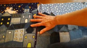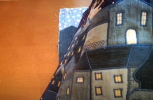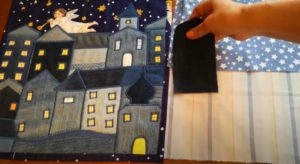 - Далее рисунок накладываем сверху на картонную заготовку, переворачиваем на изнанку и, натягивая изображение, разравниваем его и подклеиваем двухсторонним скотчем.