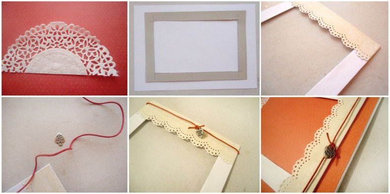 - Внешнюю рамку нужно украсить или покрасить, затем ее приклеивают сверху задника. В качестве украшений можно использовать ленту или бечевку (например, обмотать рамку), аппликации, бусины, бисер, объемные цветы и т. д.;