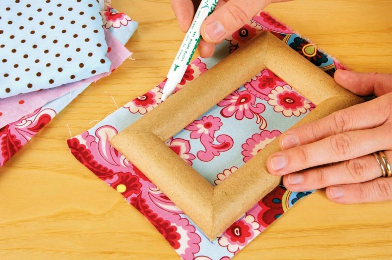 - Сверху на подготовленной основе клеим тканную часть при помощи двухстороннего скотча или клея-спрея для ткани.