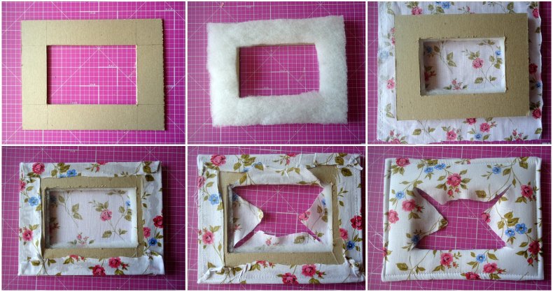 Вместо подрамника из картона можно сделать его из тонкой фанеры, украсить тканью, которая будет выполнять роль паспарту. Сверху наклеить рамку из картона так, чтобы края подрамника не были видны.