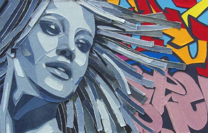 - Если вы желаете добавить разноцветные ткани, разрежьте их на маленькие полоски или фигурки и расположите их среди джинсовых фрагментов.