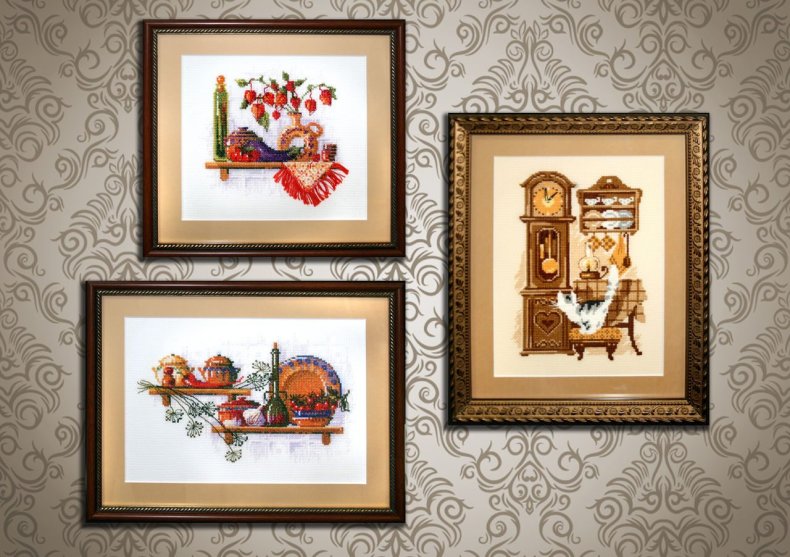 Проще всего оформлять работу в готовые рамки. Вышивку потребуется натянуть на подрамник и закрепить, затем вставить в багет, прижать к стеклу и закрепить задником.
