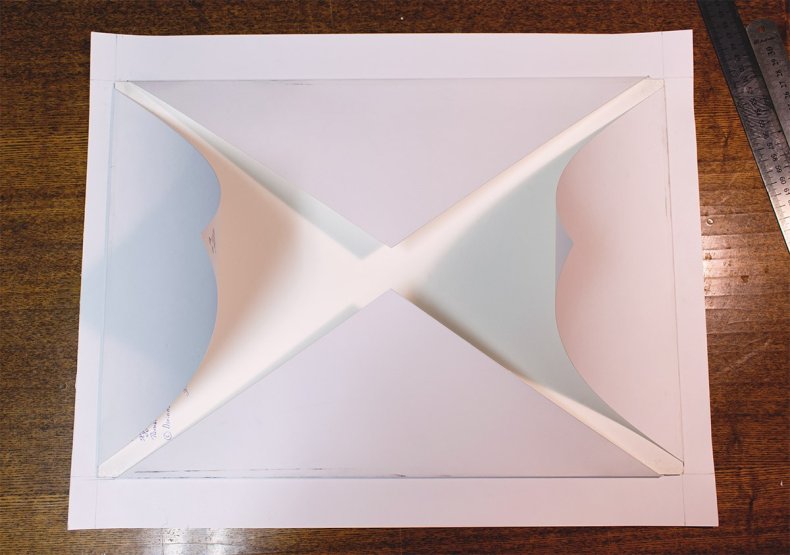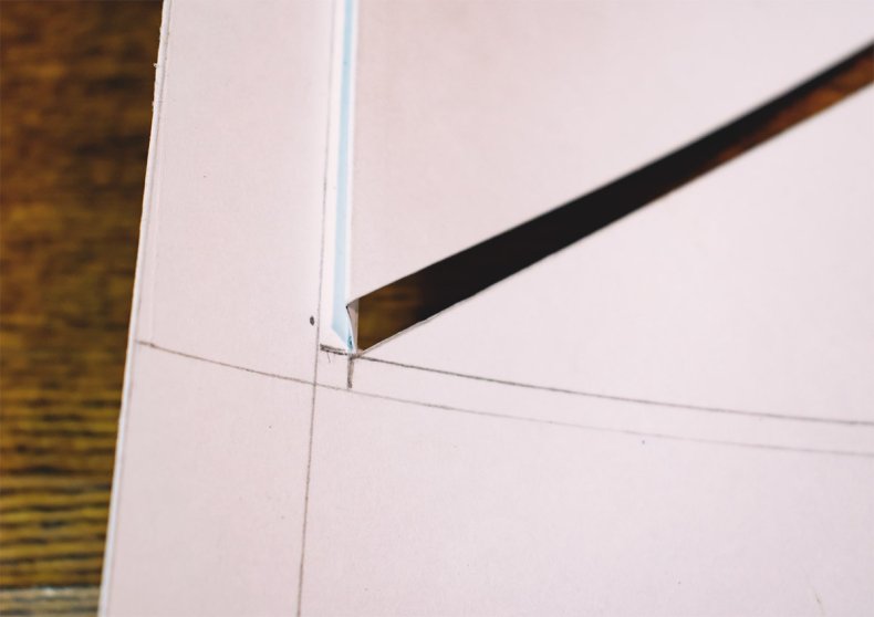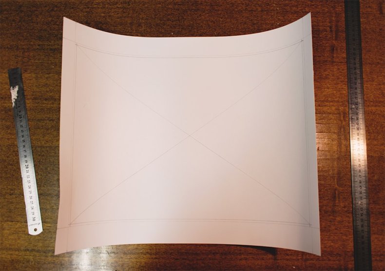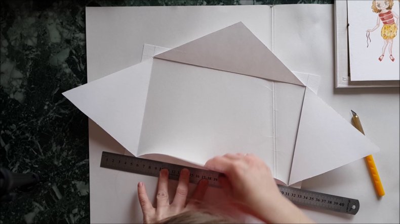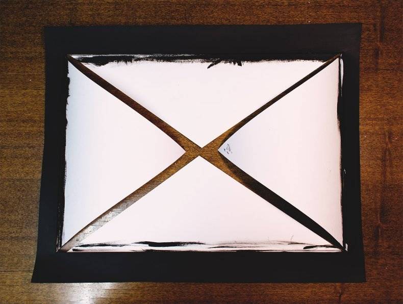 - Далее от углов прямоугольника чертим две диагональных линии, получается 4 треугольника. Так же по линиям разрезаем канцелярским ножом заготовку.