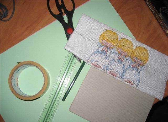 - Необходимо отмерить и отрезать лист по размеру вышивки, прибавив на каждую сторону по 3-5 см. Он будет выполнять роль задника и подрамника;