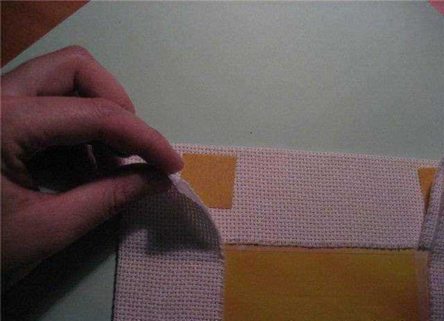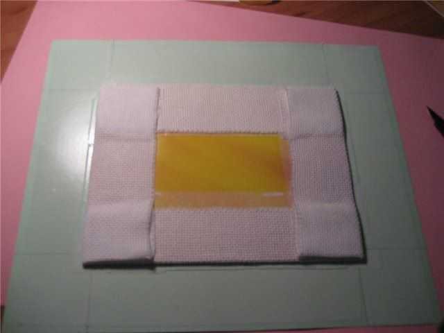 - Далее отгибаем по 0,4 см со внутренней части на изнаночную сторону и на эту рамку крепим подготовленную картину лицевой стороной.