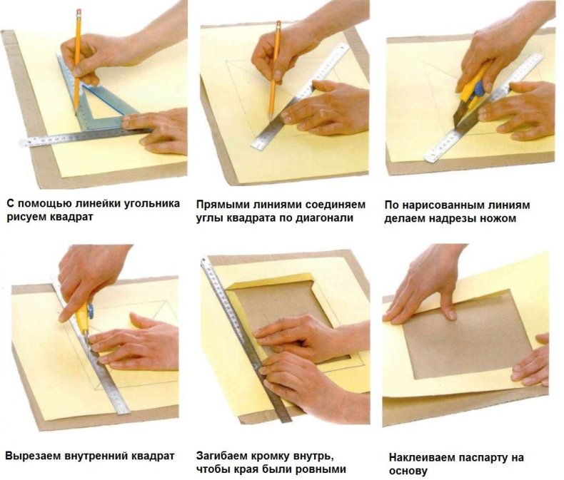 - Из картона или бумаги вырезаем по размерам картины отверстие при помощи канцелярского ножа.