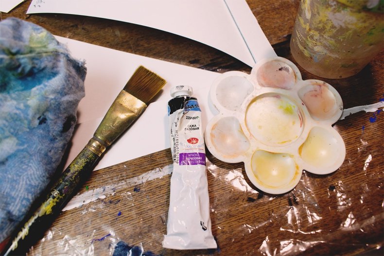- Намочите кисть в воде и нанесите небольшое количество краски на кисть.