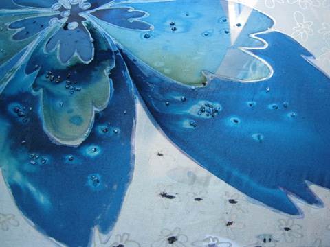 - Готовый батик обрабатывают в горячей воде. Если проглаживают утюгом, то ткань помещают между слоями бумаги, чтобы очистить ее от контурного вещества.
