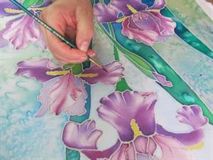 После высыхания воскового контура приступают к росписи. Пейзажи, сделанные в технике батика на шелке, получаются очень яркими, эффектными. Даже если на картине будет нарисован один единственный цветок, выглядеть это будет очень изящно. Росписью по шелку часто украшают интерьер, заключая полотна в рамки и вешая на стену.