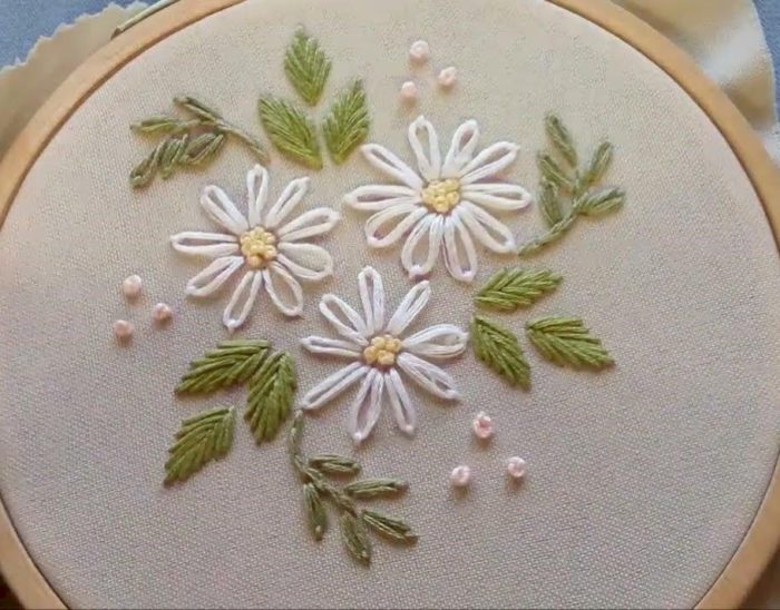 - Снимите материю с рамки и разложите на ней несколько камушков, пуговиц или крупных бусин.