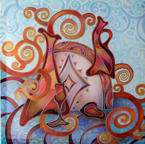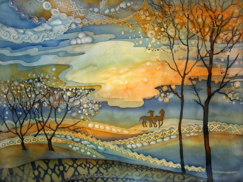 Холодный батик — это использование запаса бензина, контуры рисунка наносятся стеклянной трубкой, затем раскрашиваются расписанными вручную красками и кистями.